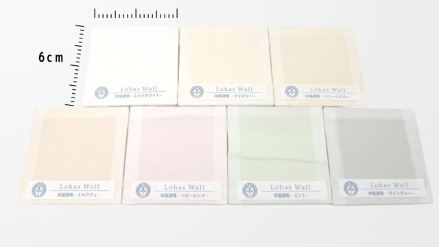 ロハスウォールがお届けするカラーサンプルは、よくある印刷物ではなく、本物の風合いが確認出来る実際の石膏ボードにプロが塗り乾いた実物をお送りします。