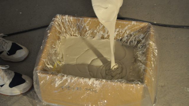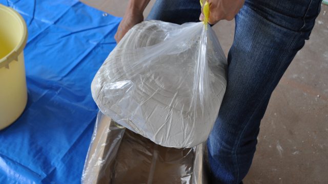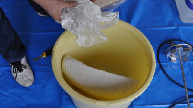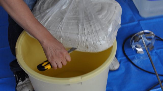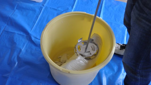 撹拌が終了したらゴムベラでバケツの淵に着いた
