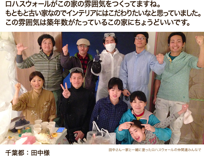 | 奥さま: | ロハスウォールがこの家の雰囲気をつくってますね。もともと古い家なのでインテリアにはこだわりたいなと思っていました。この雰囲気は築年数がたっているこの家にちょうどいいです。近所の人みんな漆喰塗ればいいのになあ(笑)。 |